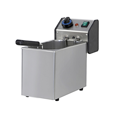 Friggitrice elettrica con vasca singola da 4 litri. Struttura in acciaio inox satinato Scotch-Brite e vasca estraibile. Testata estraibile con pannello comandi dotato di interruttore generale e termostato di regolazione. Termostato di sicurezza. Microinterruttore di sicurezza sulla testata. Cestello robusto in rete di acciaio con manico in materiale plastico atermico.